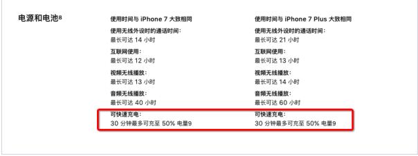 苹果并没有在发布会上提及新款iPhone支持快充,当然还是有眼尖的网友在官方页面注意到苹果的描述:可快速充电:30分钟最多可充至50%电量。