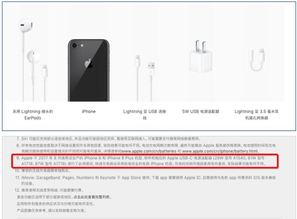 苹果还是这么高冷,尽管之前备受吐槽没有快充功能,这一次有了快充,居然也丝毫不提,实际上,从最后的注释中可以发现,尽管具备了快充功能,但随机附送的充电器却不支持快充,仍旧是祖传5W充电器。在备注中,用于测试快充功能的充电器为29W的A1540、61W的A1718,87W的A1719,均为iPad Pro、13寸和15寸Macbook Pro的电源适配器,因此,想要快速充电的话,你还需要单独购买一个充电器,此外,iPhone 8/8 Plus和iPhone X均兼容USB-PD充电协议,因此,市面上还有很多第三方的支持USB-PD的充电器也可以实现快速充电。