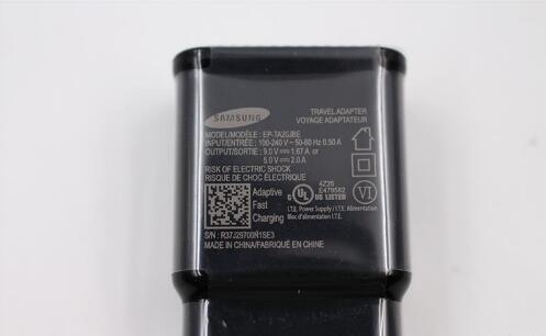 这款充电器型号为EP-TA20JBE,支持100-240V交流电输入。输出端为三星自家AFC协议标准:9V/1.67A和5V/2A。充电器由中国工厂代工,使用了英文和法文两种文字标注,但并没有指明具体的代工厂。