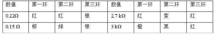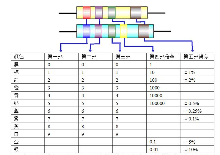 有些直接标注的电阻,是很容易识别的。可是在装配电子产品的时候,必须考虑到为以后检修的方便,把标注面朝向易于看到的地方。在手工装配时,多这一道工序,不是什么大问题,但是自动生产线上的机器没有那么聪明。而且,电阻器元件越做越小,直接标注的标记难以看清。因此,国际上惯用“色环标注法”。事实上,“色环电阻”占据着电阻器元件的主流地位。“色环电阻”顾名思义,就是在电阻器上用不同颜色的环来表示电阻的规格。有的是用4个色环表示,有的用5个。区别是:4环电阻,一般是碳膜电阻,用3个色环来表示阻值,用 1个色环表示误差。5环电阻一般是金属膜电阻,为更好地表示精度,用4个色环表示阻值,另一个色环也是表示误差。