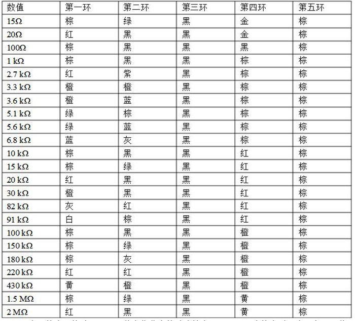 技巧2:棕色环是否是误差标志的判别。棕色环既常用做误差环,又常作为有效数字环,且常常在第一环和最末一环中同时出现,使人很难识别谁是第一环。在实践中,可以按照色环之间的间隔加以判别:比如对于一个五道色环的电阻而言,第五环和第四环之间的间隔比第一环和第二环之间的间隔要宽一些,据此可判定色环的排列顺序。