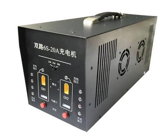 5.便携式无人机充电器 这款充电器是由郑州正方科技推出的,最大的亮点就是操作简单、便捷,在使用时直接插 上220V电源就可以直接充电,充电电流20A。充电器还有放电功能,在电池如果要存放,充电器能把电池电量充到或放到最佳的保存状态,目前是只支持6S电池的充放电,一次可以充两组,功能确实没有之前的几款充电器多,但植保上的飞机基本上用的都是6S的所以这个影响不是太大,对于植保的飞手和农民而言确实省了不少的操作流程,工作起来很简单。价格应该是偏低了1600左右。