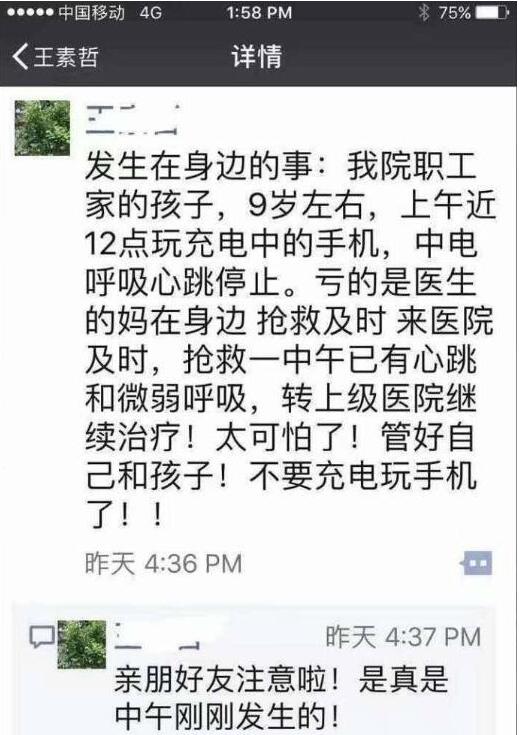 最近,不少庄里人的朋友圈都在转发这样一条信息:提醒大家,千万不要充电时玩手机!河北医科大学第二医院儿科东院区收治一名患者被电流击穿心脏,危在旦夕!