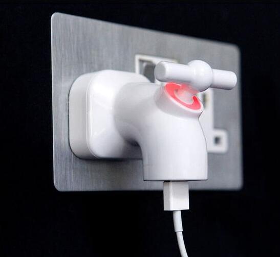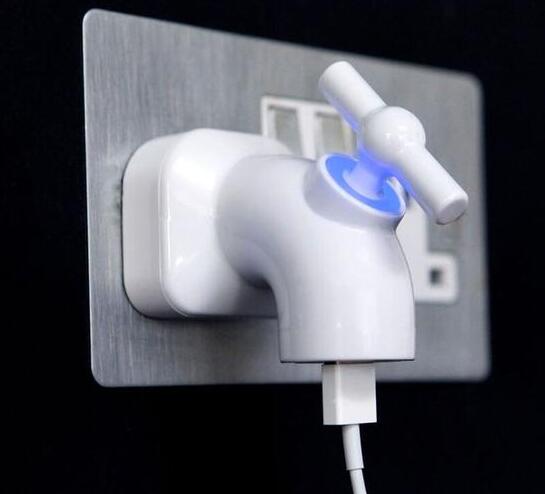 这款充电器在外观方面居然是一个水龙头的造型,看起来非常奇葩。在水龙头上,一端为电源插头,另一端为USB接口。在使用的时候,将电源插头插在插座中,然后再把手机和水龙头的USB接口连接,然后就可以为手机或者Pad等数码设备进行充电即可。