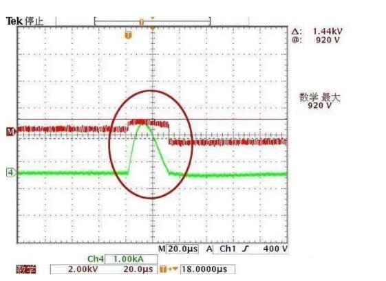 在电涌冲击一瞬间,因为有抗电涌保护,所以电压只是有略微的起伏,但仍然保持在平稳范围,保障了设备安全。、