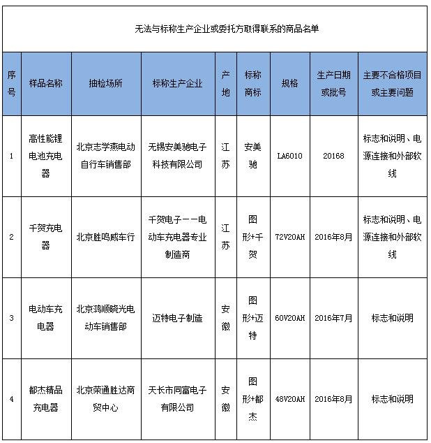 北京市工商行政管理局官网公布流通领域电动自行车用充电器质量抽查检验结果,标称“天长市鑫鹏电子”生产的“欣鹏”牌60V-12AH规格电动车充电器等40批次商品存在问题。