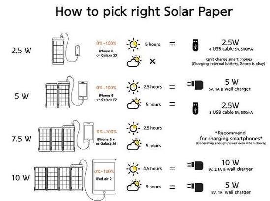 三个不同版本的充电器是用2.5W面板组合起来的。一块2.5W面板5小时就可以给iPhone 6或者Galaxy S3充满电。5W版本也可以给同样的设备充电,但是充电时间缩短到2小时,如果天上有云,那就要3小时。