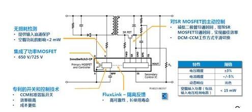 开关电源分为隔离与非隔离两种形式,对于中小功率的应用,常用的隔离电源拓扑结构有正激式和反激式。反激式指在变压器原边功率开关管导通时副边整流管截止,变压器储能。原边开关管截止时,副边整流管开始导通,能量释放到负载,周而复始的开关工作。反激式电源结构简单,省掉了一个和变压器体积大小差不多的电感,因此在中小功率电源中得到广泛的应用。从控制方式来看,InnoSwitch3系列产品初次级之间采用数字反馈的FluxLink技术进行反馈信息的传输,对初次级的开关实现精确的时序控制,可以实现非常高的效率,同时其动态响应特性极佳,而且输出纹波很小。其次级检测输出电压电流的控制方式使得该系列产品可以输出高达65W的输出功率,如果采用前级的功率因素校正电路,甚至可以输出100W的输出功率。
