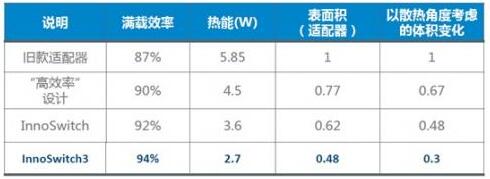 相对于上一代产品,InnoSwitch3系列的转换效率虽然只提高了2%,但是产生的热能从3.6W降低到2.7W,减少了25%,仅从散热角度考虑相对于旧款传统适配器其表面积可以减小52%,意味着可以实现更小更轻适配器的设计。
