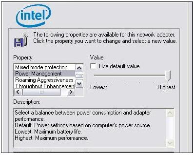 这是一些非常有趣的观点。因此,我认为至少应该举一个例子,如何进行无线网络的省电设置。下面的图片是英特尔无线客户端应用程序下,适配器设置的情况: