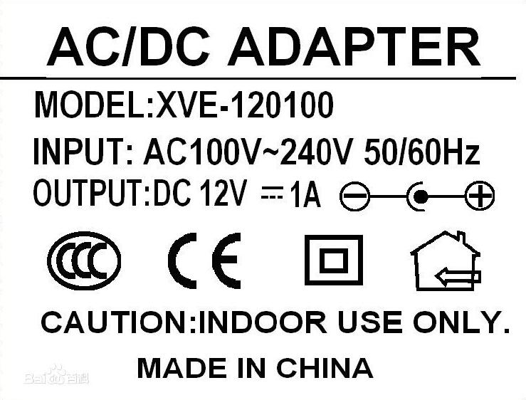 如图所示,在电源适配器(下面称adapter)的标签上面一般会有几项是需要注意的。第一,是adapter的型号,例如这颗adapter的型号是XVE-120100,它告诉了我们几个信息,就是它的厂商、主要参数等,XVE开头的一般就是##公司代号,120100就是说明这个adapter是12W的,050200的就是5W的;第二就是adapter的