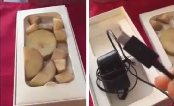 她在确认手机一切正常之后,就买下了这部手机。但是回家后她打开包装却发现,盒子里没有iPhone 6,只有11块已经变质的土豆……