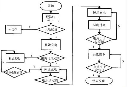 上电后,单片机首先检查电池是否接反,电池电压是否因为电而过低,如果电压过低,先使用小电流给电池充电一间,使电压达到三阶段充电常水平在开始充电,如果电常则直接进入正常充电阶首先是恒流充电阶段,充电小于0.5 C,一般取0.1 C,电压会缓慢的上升,当电压到一定阶段(本例中采用电60V)改为恒压充电,此时随电过程的进行电池内阻会逐升,充电电流会随着内阻的而减小,当单片机检测电流减小到一定的值(小于恒流充电值的1/1 0),立即转入涓流充电阶段,充电电流一般取0.3C,在此阶段电池电压会减小,当充电电流小于0.0 1 C时即可认为电池已充满,单片机会自动将电池从充电电路中切除。在恒压阶段如果单片机检测到电池温度高于45度则自动转入第三阶段,待温度下降后再转入第二阶段。充满后通过单片机关断继电器,停止充电.。